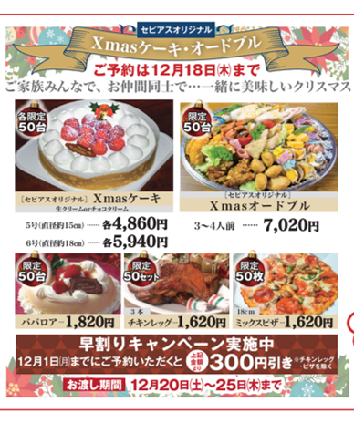 クリスマスケーキ・オードブル等のご案内 ご予約期間:12月18日(木)まで お受け取り:12月20日(土)~25日(木) 早割キャンペーン 12月1日までのご予約で各種300円引き ※チキンレッグ・ピザを除く ご予約・お問合せはお電話で! TEL:0143-21-1010